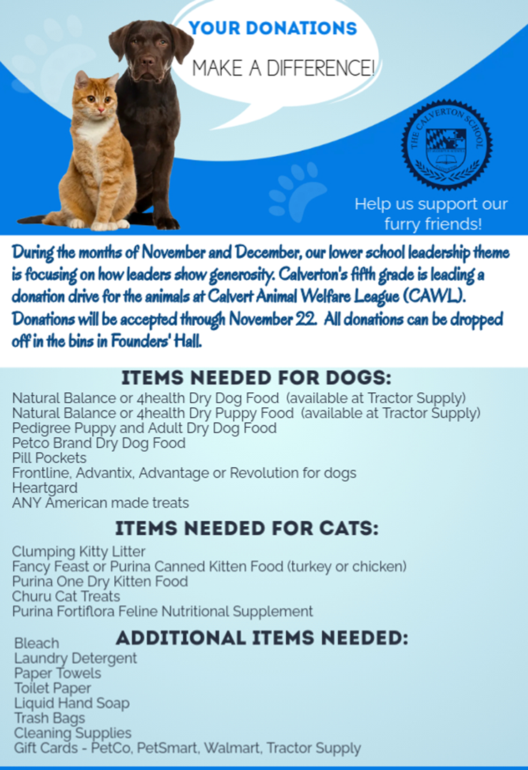 For the months of November and December, lower school students will be focusing on how leaders are kind and show generosity to others. As we begin the season of giving, several classes will create thank you cards for service members near and far. They will also start preparing for their Giving Tuesday projects and discussing the importance of service learning. Each grade level will be making something that will be given to an organization within our local community. Our fifth grade recently took a trip to Calvert Animal Welfare League (CAWL) to learn about how the volunteers care for animals at their shelter. Fifth grade will be leading the lower school in a donation drive for CAWL (see below). We will also be taking part in a coin collecting challenge during the book fair week. The money collected will be donated to CAWL. Donation bins are located in Founders Hall until Friday, November 22. Fifth grade will sort and deliver the donated items to the shelters after returning from Thanksgiving break. Thank you for helping our children learn the importance of giving to others in need.