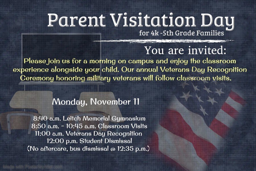 Please join us for our annual 4K-5th grade Parent Visitation Day and Veterans Day Recognition Ceremony on Monday, November 11. The morning will begin in the gym at 8:40 a.m., then move to the classrooms. Be ready to go back in time and be a kid again as you enjoy a morning at school. We promise not to be too hard on you. We will finish up classroom visits at 10:45, and the Veterans Recognition Ceremony will begin at 11:00. The assembly will include the Andrews Air Force Base Honor Guard, the Pledge of Allegiance led by our kindergarten students, fourth and fifth grade students performing “The Star Spangled Banner” and “Salute to the Armed Forces,” and special guest speaker, Col Michael “Dino” Dehner, Retired Marine and Calverton parent. This is a noon dismissal day for all students. There is no aftercare. Students will need to wear dress uniforms for this date.